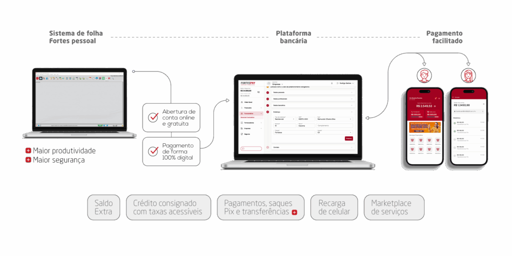 Com a Fortespay, você tem uma jornada completa e 100% integrada ao seu sistema de folha — e acaba, de uma vez por todas, com a rotina exaustiva.